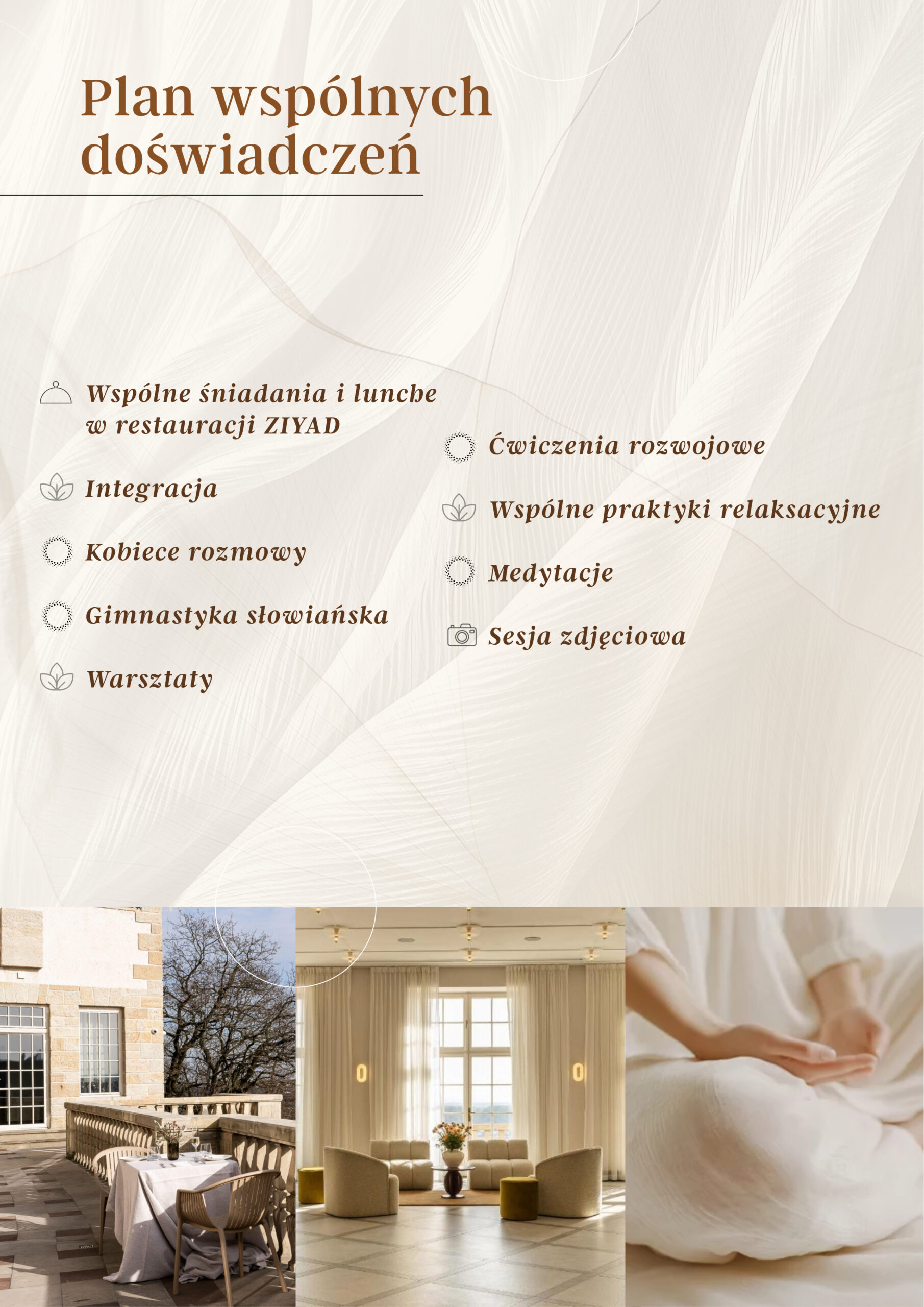 Ten wyjazd to czas na refleksję i ukojenie. Dzięki autorskim warsztatom rozwojowym, relaksacyjnym praktykom i spotkaniom z innymi kobietami – odnajdziesz balans i głębsze połączenie ze sobą.