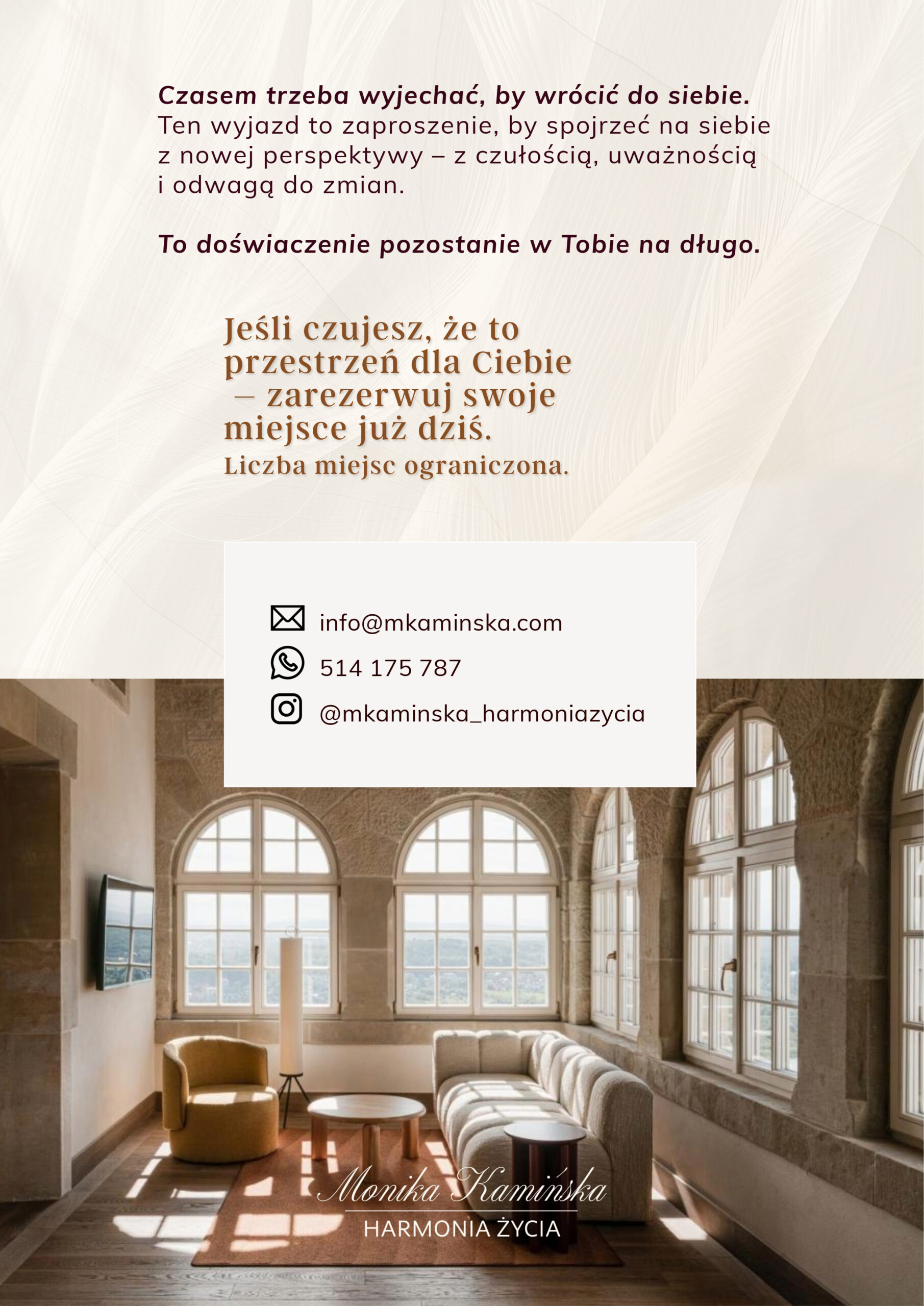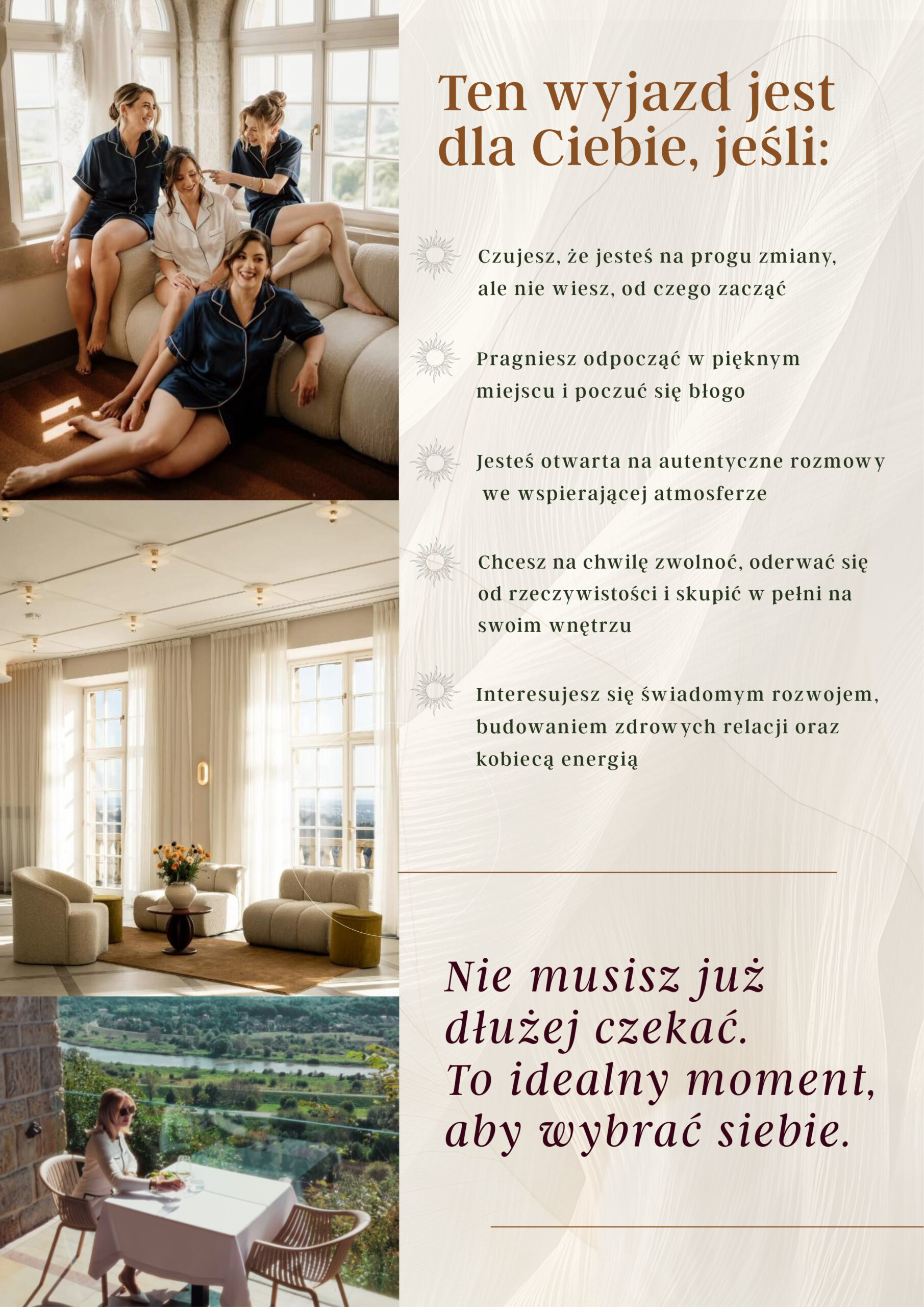 Ten wyjazd to coś więcej niż odpoczynek. To przestrzeń, w której możesz na nowo połączyć się z własną kobiecością, zatrzymać się w pędzie codzienności i poczuć, jak to jest żyć w zgodzie ze sobą.